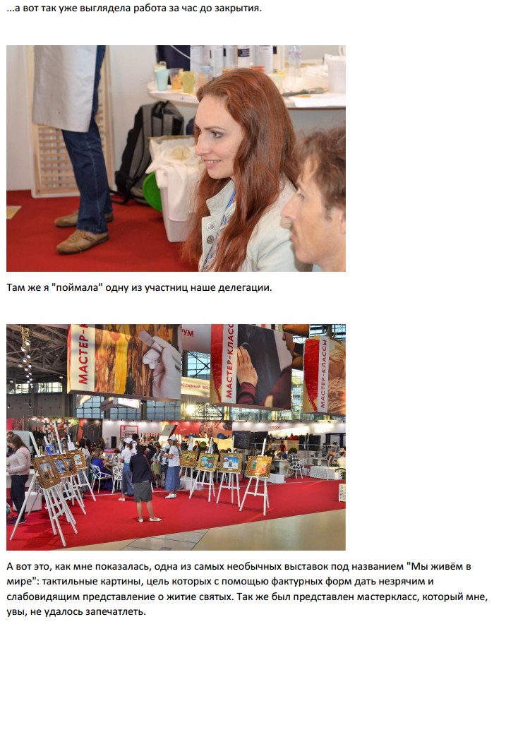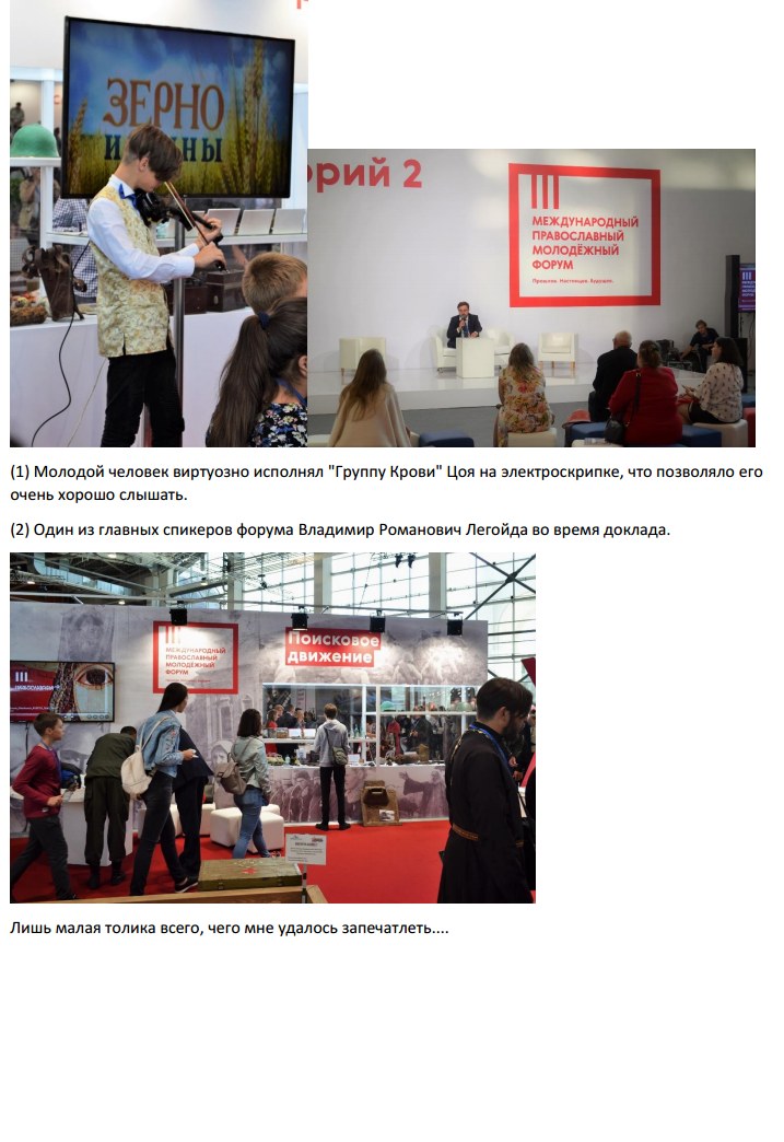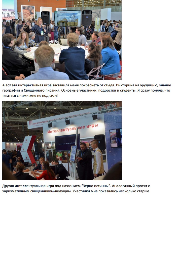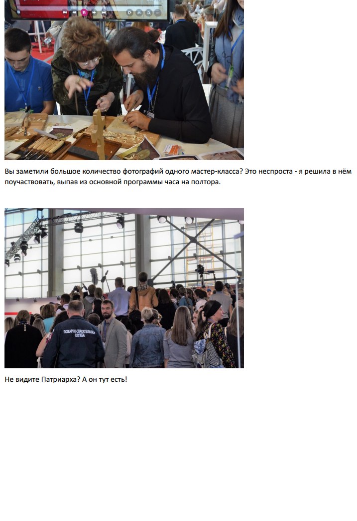 Исторические доклады, лекции значимых лиц из духовного и светского мира, творческие мастерклассы, танцы и пение, презентации самых невероятных проектов вроде "Батюшки онлайн" (консультации с духовенством через интернет) или объединение православных байкеров "Мотобратия во Христе", занимающихся благотворительностью и паломническими поездками, а так же интеллектуальные игры, дискуссии и круглые столы. Так же проводился ряд спортивных состязаний с прямой трансляцией - вот только по телевидению или через интернет я так и не поняла. Пиком программы была речь Святейшего Патриарха Кирилла, чей микрофон любезно подключили ко всем колонкам в зале, чтобы и те, кто не попал к нему напрямую, могли послушать проповедь.