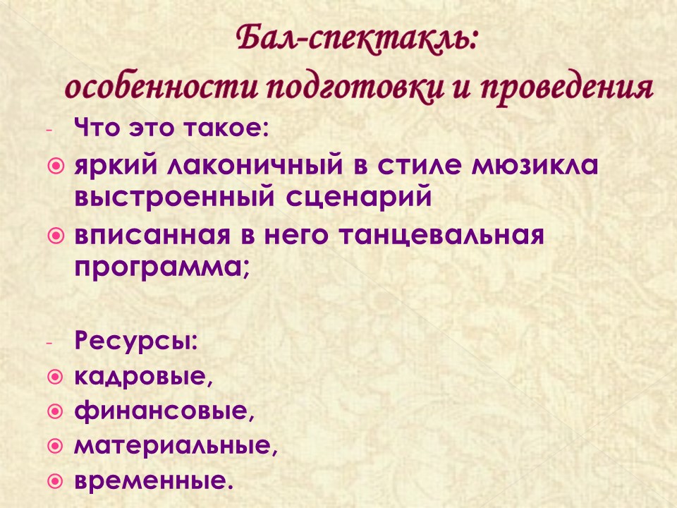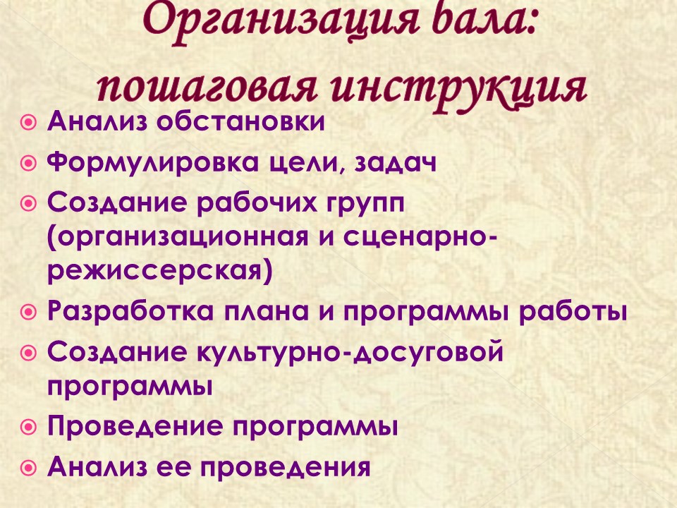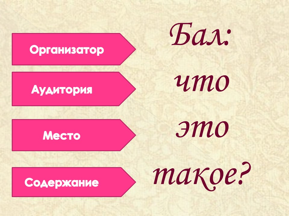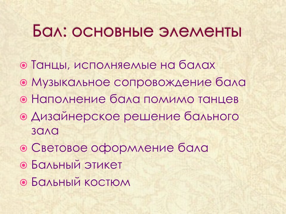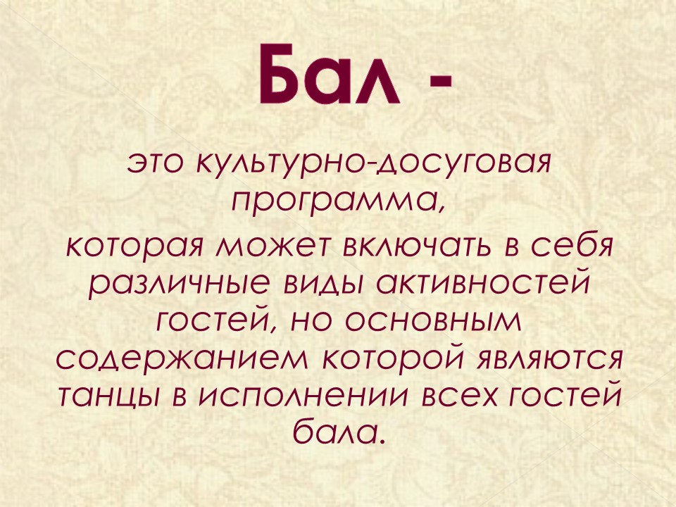 Бал - это культурно-досуговая программа, которая может включать в себя различные виды активностей гостей, но основным содержанием которой являются танцы в исполнении всех гостей бала.